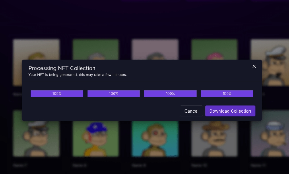 You need your NFT Art ready before you can Generate a collection. You can use our Demo collection to test our Generator.