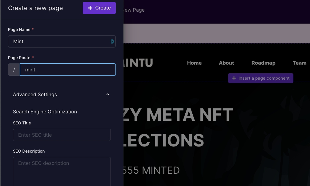 You can add more pages, for example, your Minting page, NFT Gateway for premium content, or just a contact page. Press on the Top New page and fill in the name and URL.