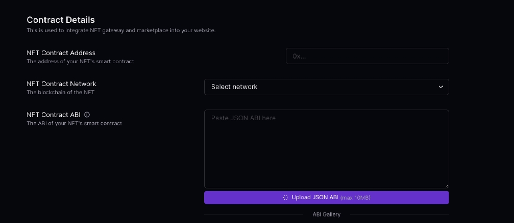 In case you want to use the NFT integration you need to fill in the smart contract details. To use the NFT integrations like:
