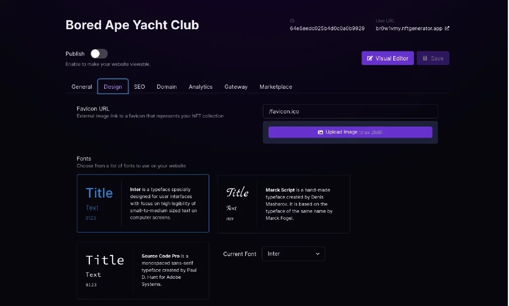 You can use our Free subdomain and change this subdomain to a custom name. It’s also possible to connect a custom domain you own, for example, bayc.com. By connecting the A-record, Cname, or Nameserver.
